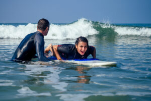man instructor demonstrating how to paddle in the water by hands on surfboard to indian woman in surf class in Goa sea