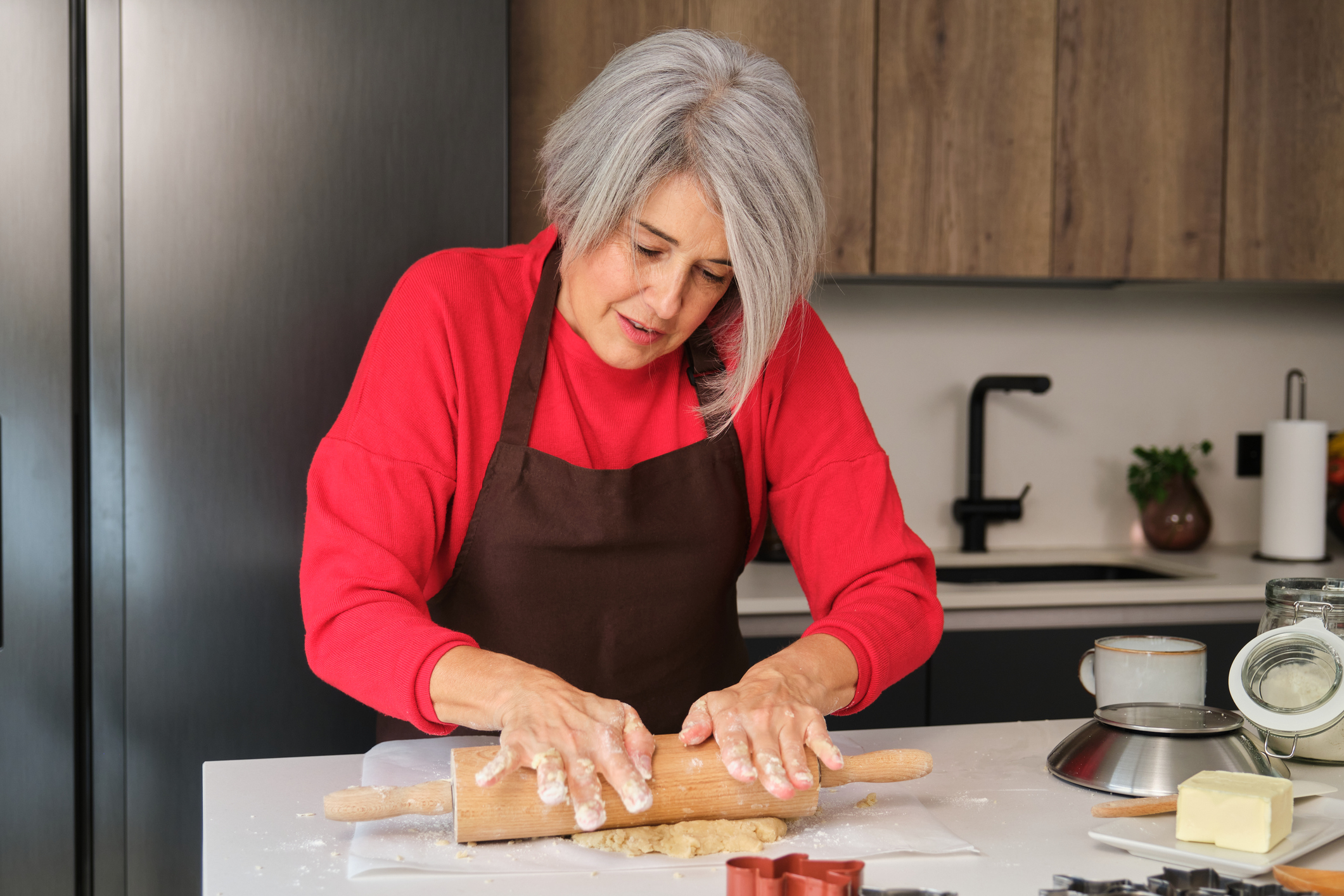 Woman using rolling pin preparing dough for Christmas cookies